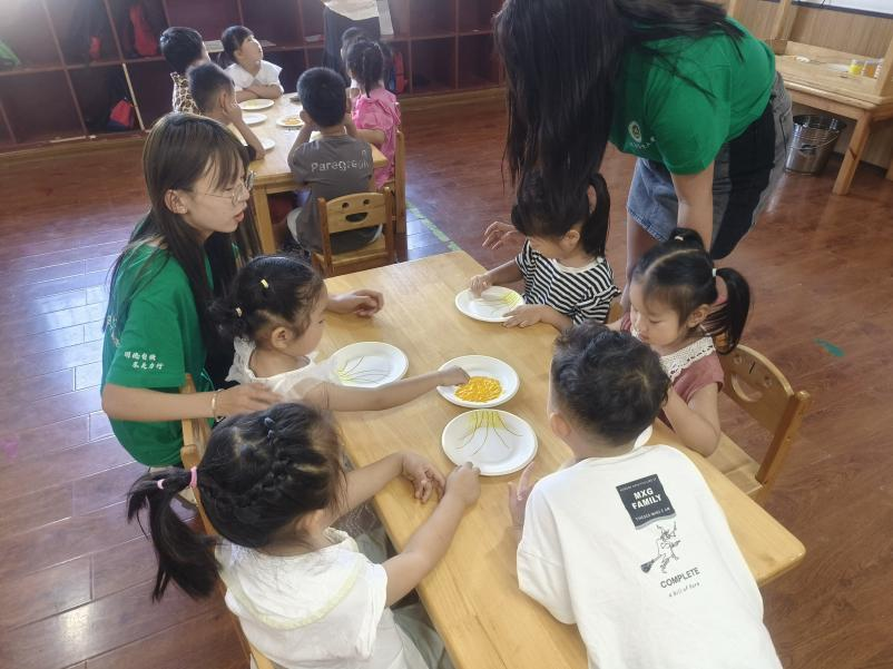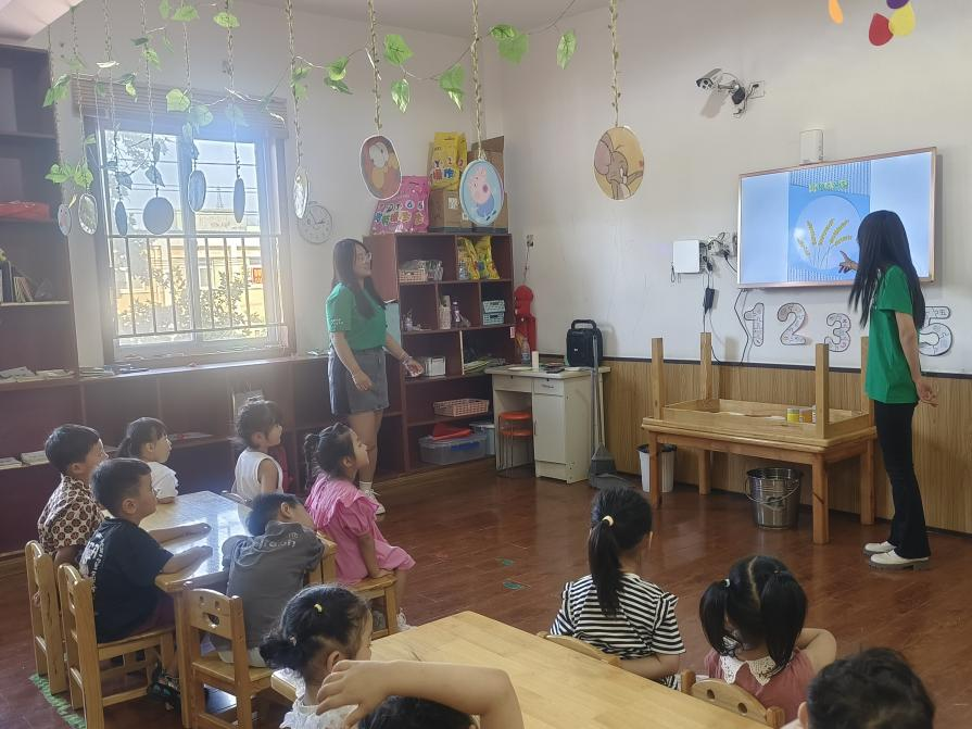 实践活动中,团队成员给孩子们进行了二十四节气的知识科普,帮助孩子们学习传统文化知识,随后通过手工制作传统二十四节气装饰画,带领孩子们亲身体验中国传统文化的魅力。学生用圆形纸盘和彩色颜料进行绘画,向孩子们展示手工的制作过程,之后便让孩子们自己动手体验。团队成员逐步引导每个孩子完成手工制作。在整个课程中,孩子们的脸上洋溢着甜蜜笑容,真正实现寓教于乐。
