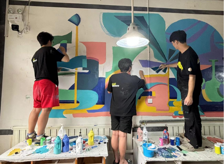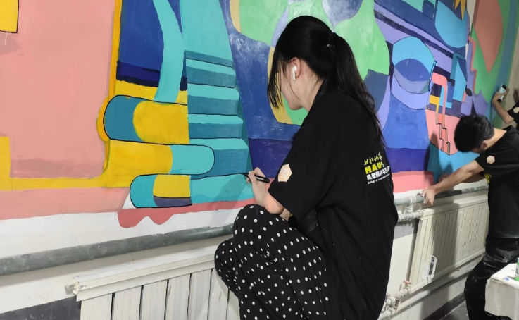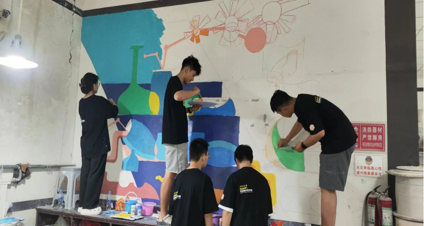 经过一天的辛勤努力,乡村艺绘队的成员基本完成了两幅墙面的绘制工作,这些墙面丰富了工作室室内环境的色彩构成,同时抽象的画法也为绞胎瓷的在色彩,形状,纹理等方面的创新提供了新的思路。在接下来的社会实践中,小黄书 墙绘队将为绞胎瓷的非遗文化传播与发扬做出贡献,为乡村振兴添“油”加“彩”。