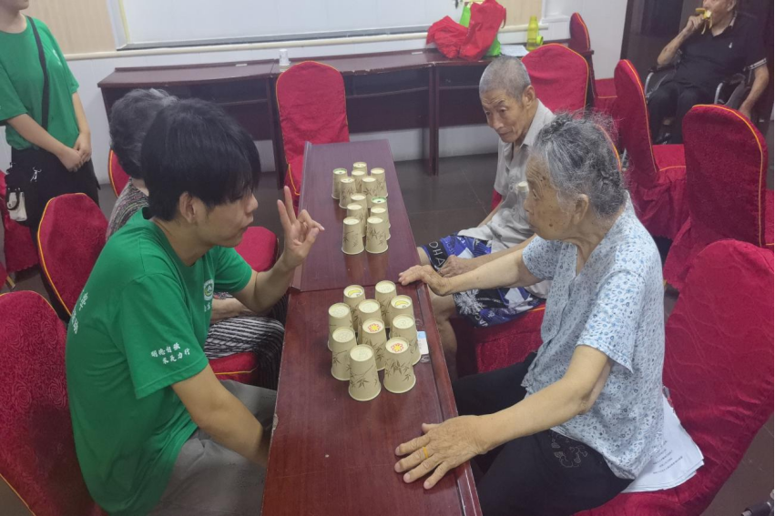 活动期间,团队成员为老人们组织了击鼓传花、杯子叠叠乐、念口令抢杯子等多项娱乐游戏,锻炼了老人们的反应力和记忆力,现场氛围热烈活跃。