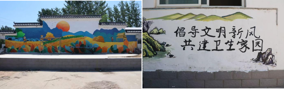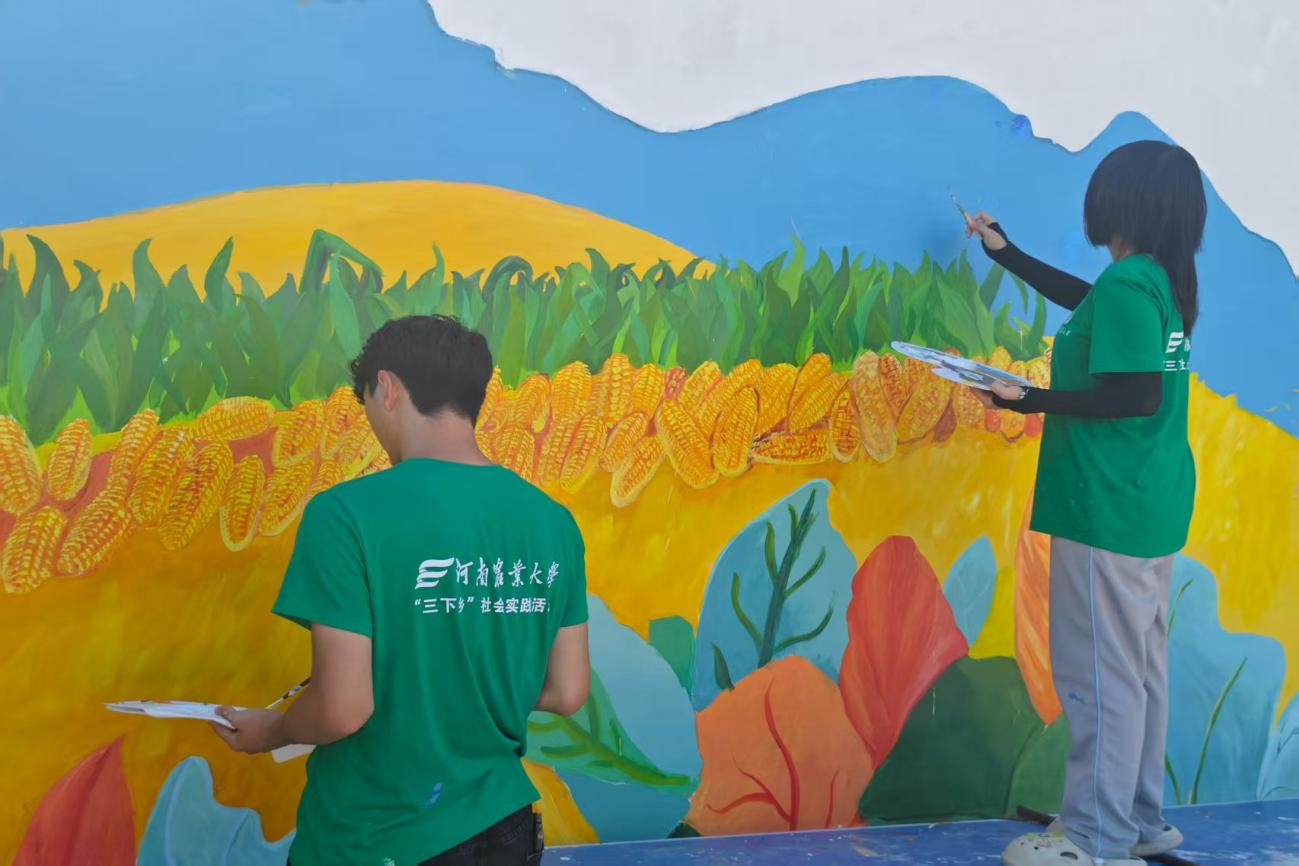 创作现场,成员们分工明确,墙绘组手持勾线笔精雕细节,沿着玉米轮廓反复勾勒;标语组则精心规划布局,以“生态宜居乡村美”“传承乡土文化”等标语搭配鲜艳色彩,使文字与画面相得益彰。经过成员们协作,墙绘作品与标语共同构成了一道乡村文化风景线。