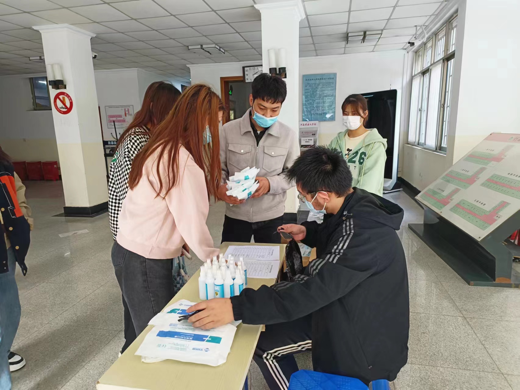 在文化路校区开展防疫物资发放活动。院团委老师芦嘉俊在13号楼一楼大厅组织为小黄书