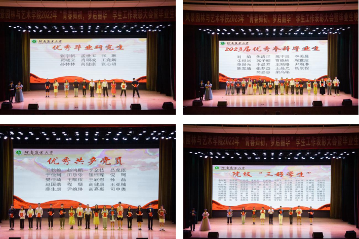 在各篇章间隙穿插举行了学生工作表彰颁奖仪式,一次次将晚会气氛推向高潮。在热烈的掌声中,主持人依次宣读优秀共产党员、三好学生、优秀毕业研究生、优秀本科毕业生等12项奖项获奖名单,学生代表依次登台,领导老师为其颁奖。