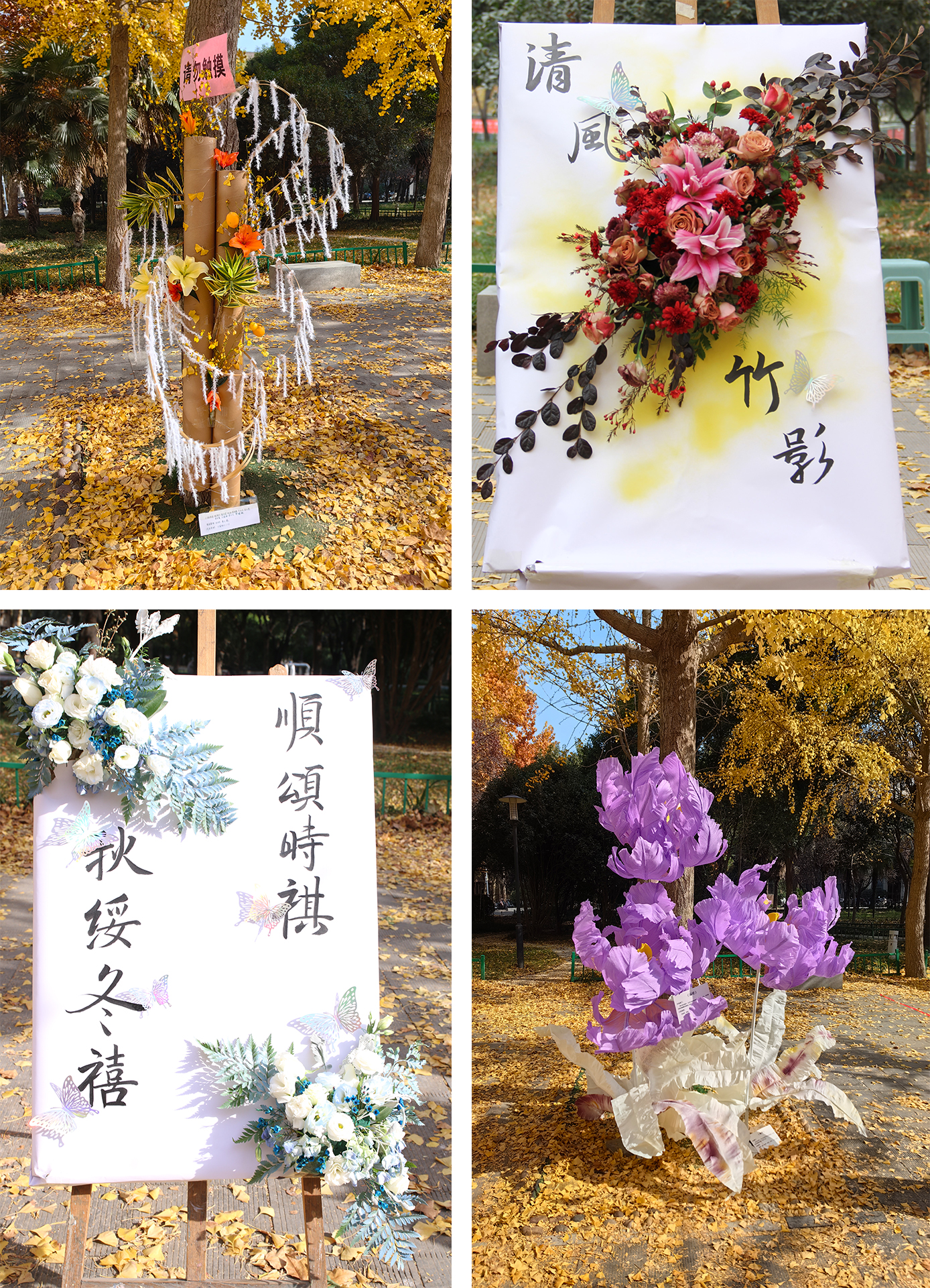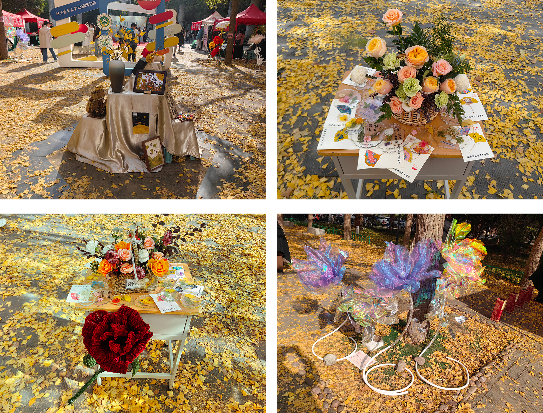 活动现场,结合专业特点,举办了手工花卉作品展和《插花与盆景》课程作品展。以银杏叶为素材制作的瓶插花、手工画、花束、雨伞、滴胶等等手工艺品展示了学院学生独特的想象力和创造力。皱纹纸的《鱼戏莲叶间》、玻璃纸的《山间夕照》、欧根纱的《梦中的恋人》、扭扭棒的《梦舞缤纷》在满地金黄的银杏叶上悄然绽放,把在场师生带入了梦幻的仙境花园当中。学院副教授石力匀现场介绍每一幅作品的内涵及制作工艺。一件件作品精巧细致、新颖独特、形式多样,展现了学生们浓厚的艺术发展兴趣和扎实的动手实操能力,为师生带来了一场视觉盛宴。