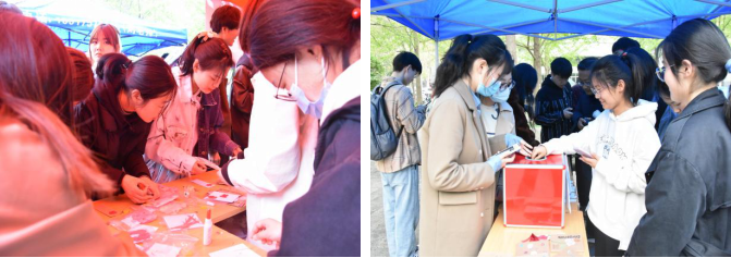 下午三点,在微雨蒙蒙,花香萦绕的中心花园广场中,一群身着汉服的学生在树下翩翩起舞,文化节在学院艺术团悠扬的歌声和曼妙的舞姿中拉开序幕。本次活动形式丰富多彩,分为作品展示、文创制作、彩绘美甲体验和花谜竞猜四个部分。活动展示的作品为学院师生通过压花技术用干花制作而成的各类工艺品。包括画、团扇、灯笼、纸质书签、木质书签、笔记本等,集思想性、艺术性、观赏性于一体,与中华优秀传统文化紧密结合,充分体现了广大师生的审美情趣和艺术素养。在文创制作区,现场的师生们充分发挥想象力和创造力,积极热情地参与到DIY压花书签的创作中。与此同时,彩绘美甲体验区、花谜竞赛区也吸引了过往行人纷纷参与其中。活动现场气氛热烈活跃,师生们交流经验、相互学习,制作出一件件精美而又富有设计感的作品。活动结束后,广大师生们感受颇丰,纷纷表示在今后的学习生活之余将更多地走进自然,关注中华传统文化传承,真正让自己的文化内涵与审美情趣得到升华。