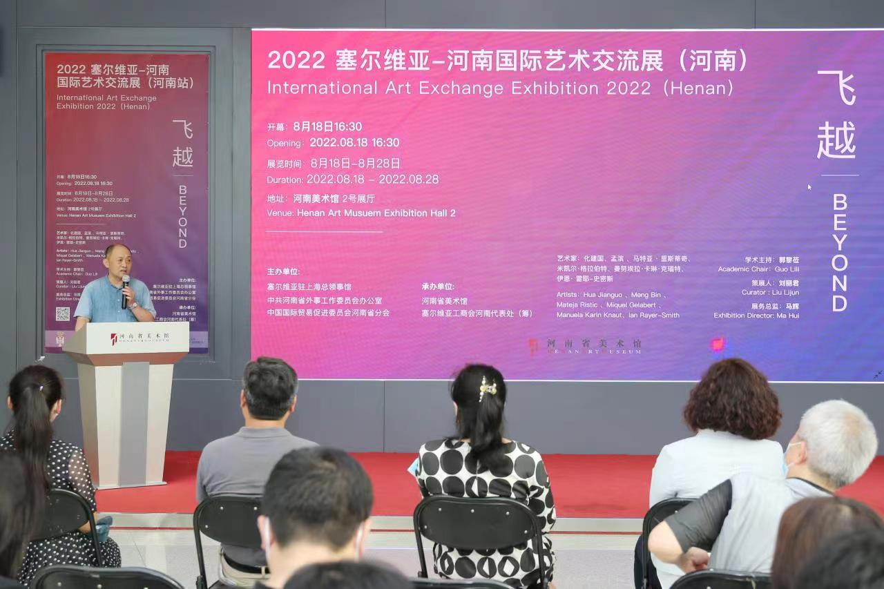8月18日下午,“飞越·2022塞尔维亚-河南国际艺术交流展”在河南省美术馆正式开幕,小黄书 艺术系孟滨教授受邀参展并致辞。校党委副书记、工会主席李成吾,国际交流合作处处长屠克,学院领导及相关教师出席活动。