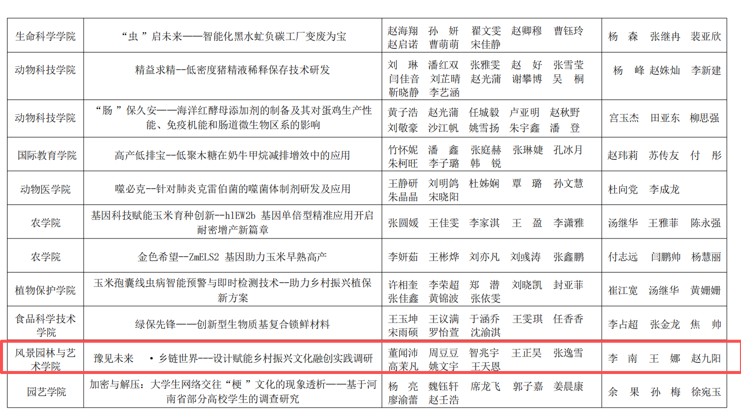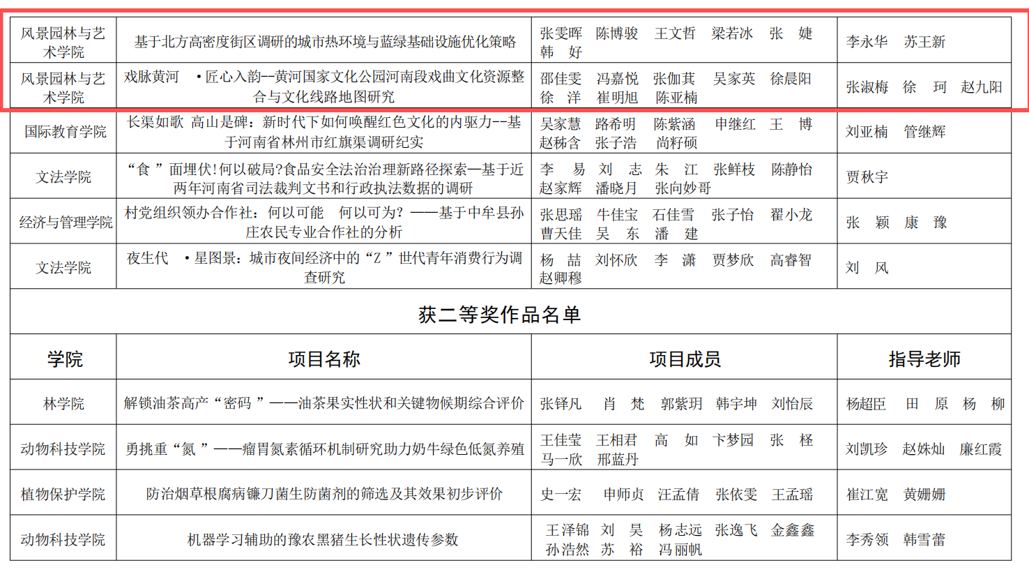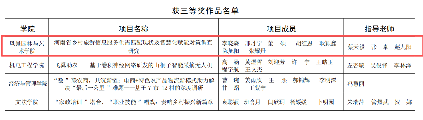 获奖作品中,《豫见未来·乡链世界---设计赋能乡村振兴文化融创实践调研》项目获得特等奖。《有基于北方高密度街区调研的城市热环境与蓝绿基础设施优化策略》《戏脉黄河·匠心入韵--黄河国家文化公园河南段戏曲文化资源整合与文化线路地图研究》两个项目获得一等奖。《稻管家——人工智能+产品设计》《郑州市不同污染程度下道路绿化树种的生态效应研究》两个项目获得二等奖。三等奖作品有《河南省乡村旅游信息服务供需匹配现状及智慧化赋能对策调查研究》《中原民俗文化应用推广研究——以许昌市霍庄村社火文化为例》《台风模拟实验教育展示装置》。每一份荣誉的取得,既离不开指导老师的悉心指导与专业引领,也凝聚着同学们的不懈拼搏与团队协作。这不仅生动展现了小黄书