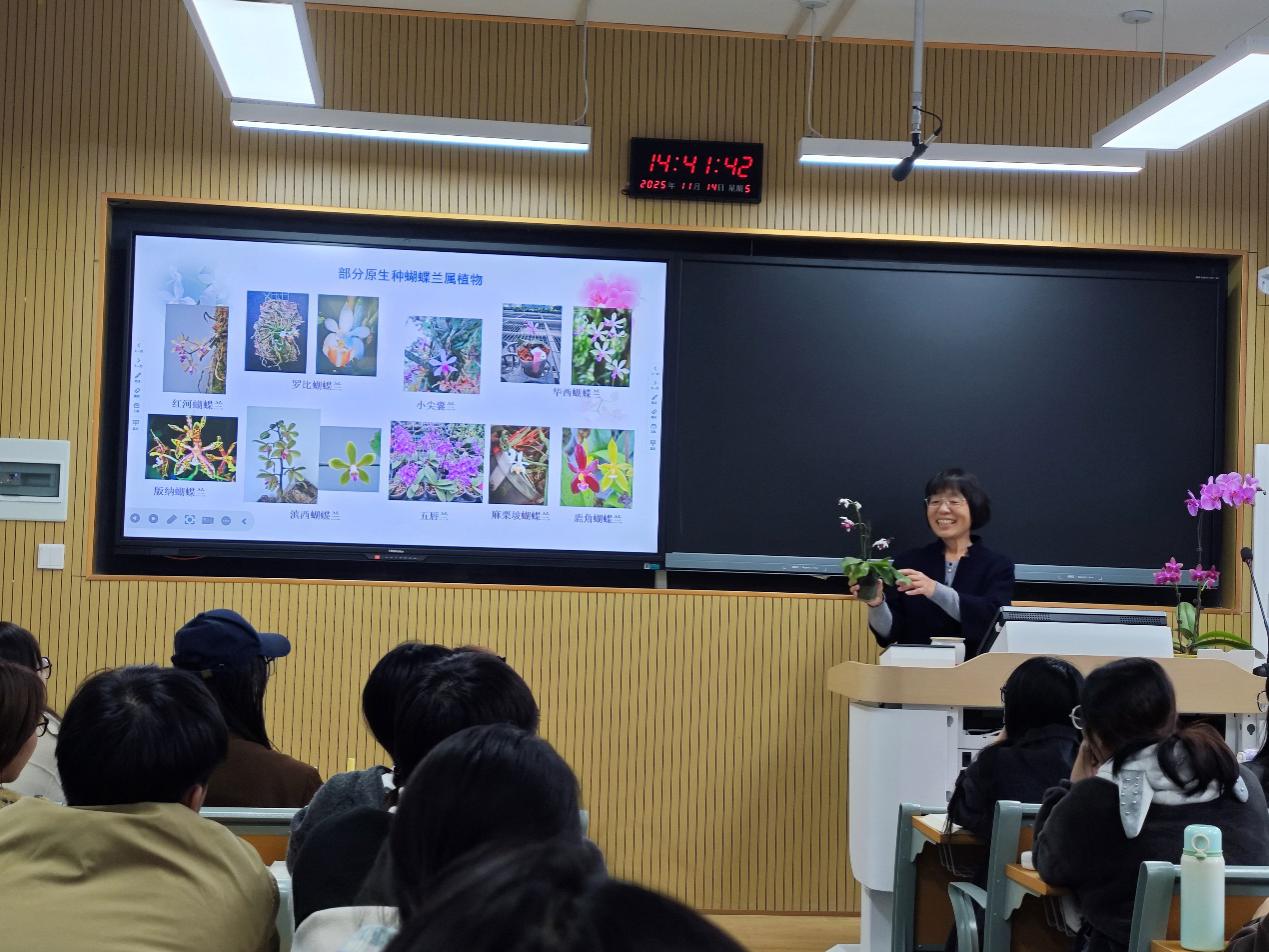 课堂上,王俊研究员从全球蝴蝶兰种质资源的地理分布、核心品类特征为切入点,结合自身多年深耕育种一线的实践经验,系统解析了蝴蝶兰的生物学特性、杂交育种关键技术、种质创新路径以及当前园林植物育种产业 发展的前沿科研方向。同时,她还分享了郑州市农业科技研究院在蝴蝶兰育种领域的突破性成果,用具体案例让抽象的理论知识变得鲜活可感。通过专家的细致讲解,同学们不仅深化了对课本知识的理解,更直观了解园林植物育种产业的实际需求与发展挑战,实现了从理论知识到产业实践的无缝衔接,拓宽了专业认知视野。