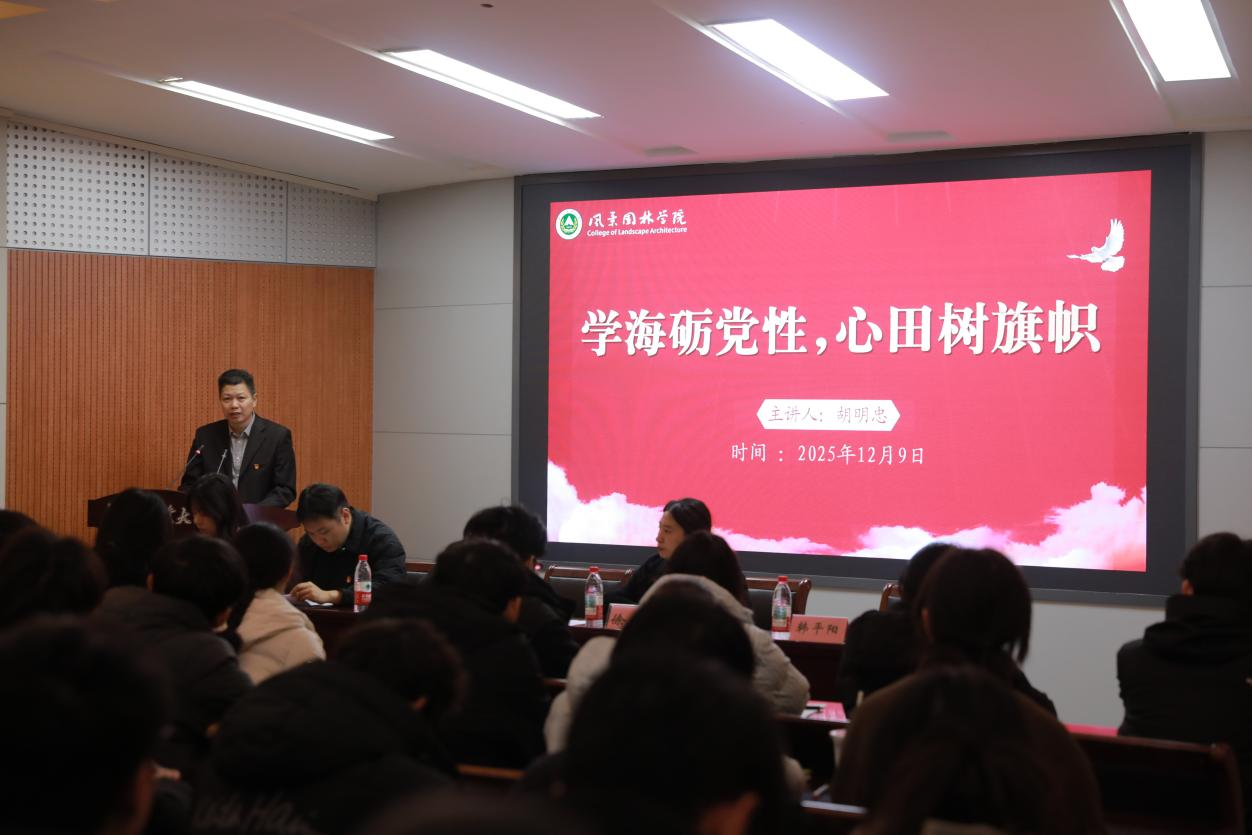 胡明忠总结讲话并讲授专题党课。他代表学院党委向新发展的和转正的师生党员表示热烈祝贺,向辛勤培育青年党员的党建工作者致以诚挚感谢。他指出,学院将坚持“围绕专业抓党建、抓好党建促发展”思路,将思想政治教育与学院专业培养深度融合,此次党员发展与转正工作是学院“为党育人、为国育才”的扎实实践。他结合专业学科特色与新时代党员要求,提出三点希望:一是以“优”为尺,在“量减质优”中彰显景园党员先进性,把先进性转化为专业上的“领头雁”、实践中的“排头兵”;二是以“责”为要,在生态文明建设、乡村振兴等时代机遇中扛起使命担当,让党员身份成为干事创业的“通行证”和服务人民的“荣誉章”;三是以“信”为魂,在“思想入党”中永葆初心本色,将党的创新理论转化为专业实践的“金钥匙”,以笃行实干践行入党誓言。