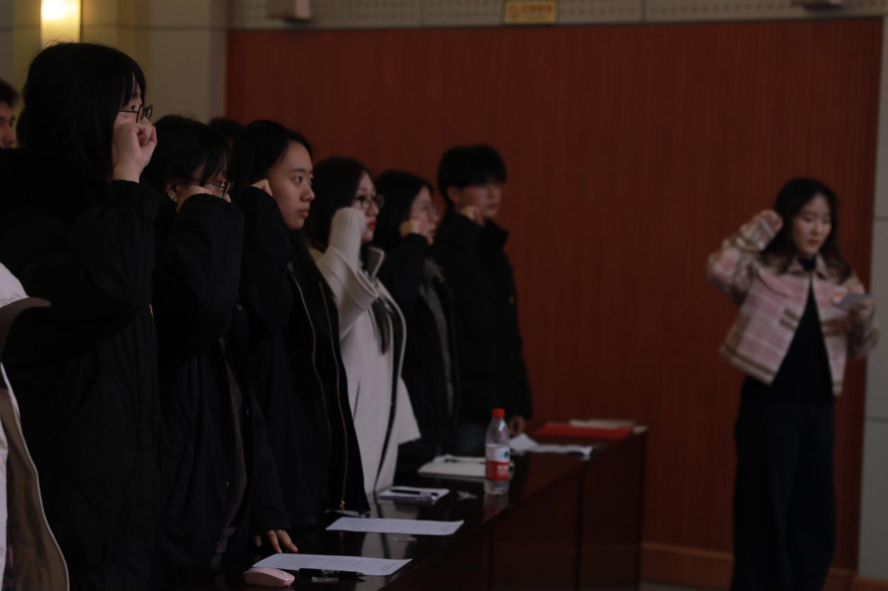 新党员同志郑重佩戴党员徽章。熠熠生辉的党徽佩戴于左胸,既是荣誉的象征,更是责任的嘱托。随后,在党员代表张怡雪的带领下,全体宣誓人面向鲜红党旗,举起右拳,庄严宣读入党誓词。铮铮誓言响彻会场,字字千钧映照初心,既是对党组织的郑重承诺,更是融入血脉的信仰宣言。
